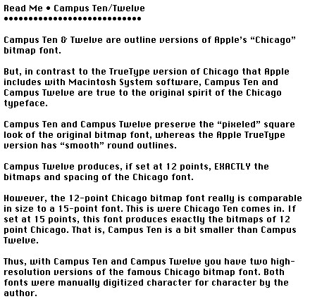 CampusTen & CampusTwelve are outline versions of Apple's "Chicago" bitmap font. In contrast to other implementations, however, these fonts preserve the pixeled square look of the original bitmaps. If set at 12 points, Campus Twelve produces exactly the screen representation and spacing of the original bitmap-only font. Besides being the Mac's System font for years, Chicago has also been used on the iPod.