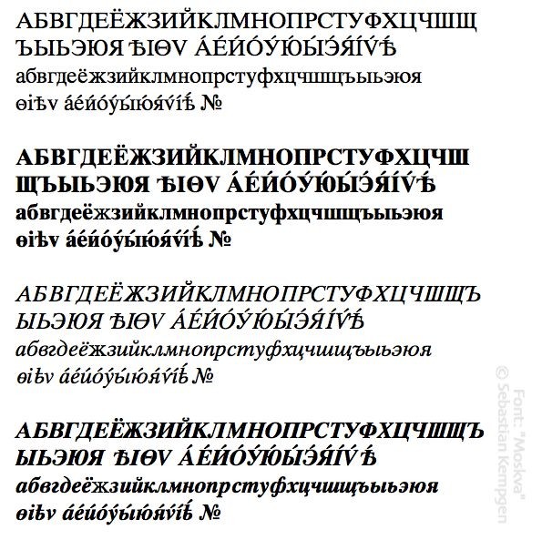 Unicode: Die Unicode-Version heißt "Mosvka Pro". Diese Version kann zusätzlich zu Moskva installiert und benutzt werden!